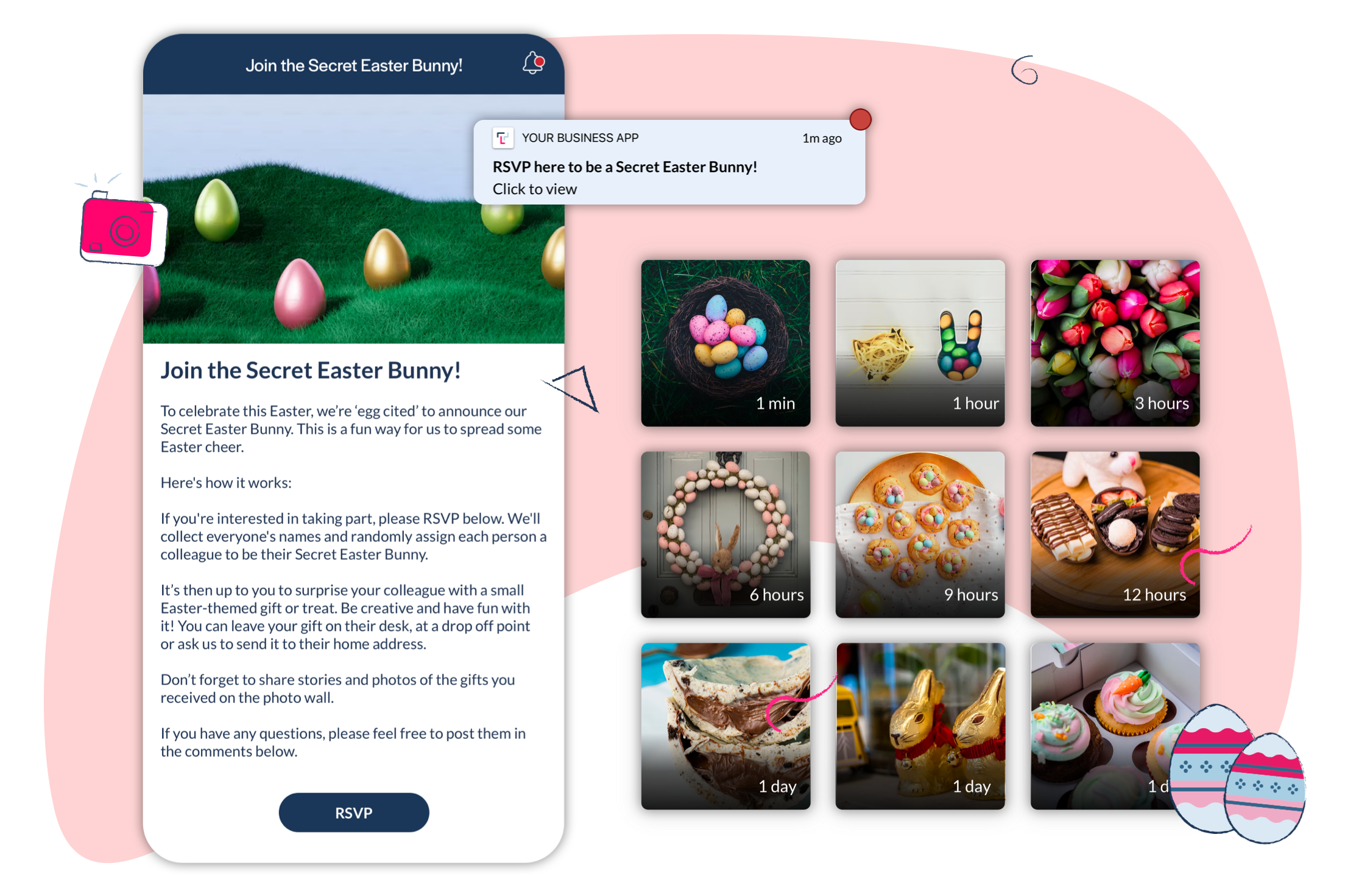 Sample push notification text: RSVP here to be a Secret Easter Bunny!