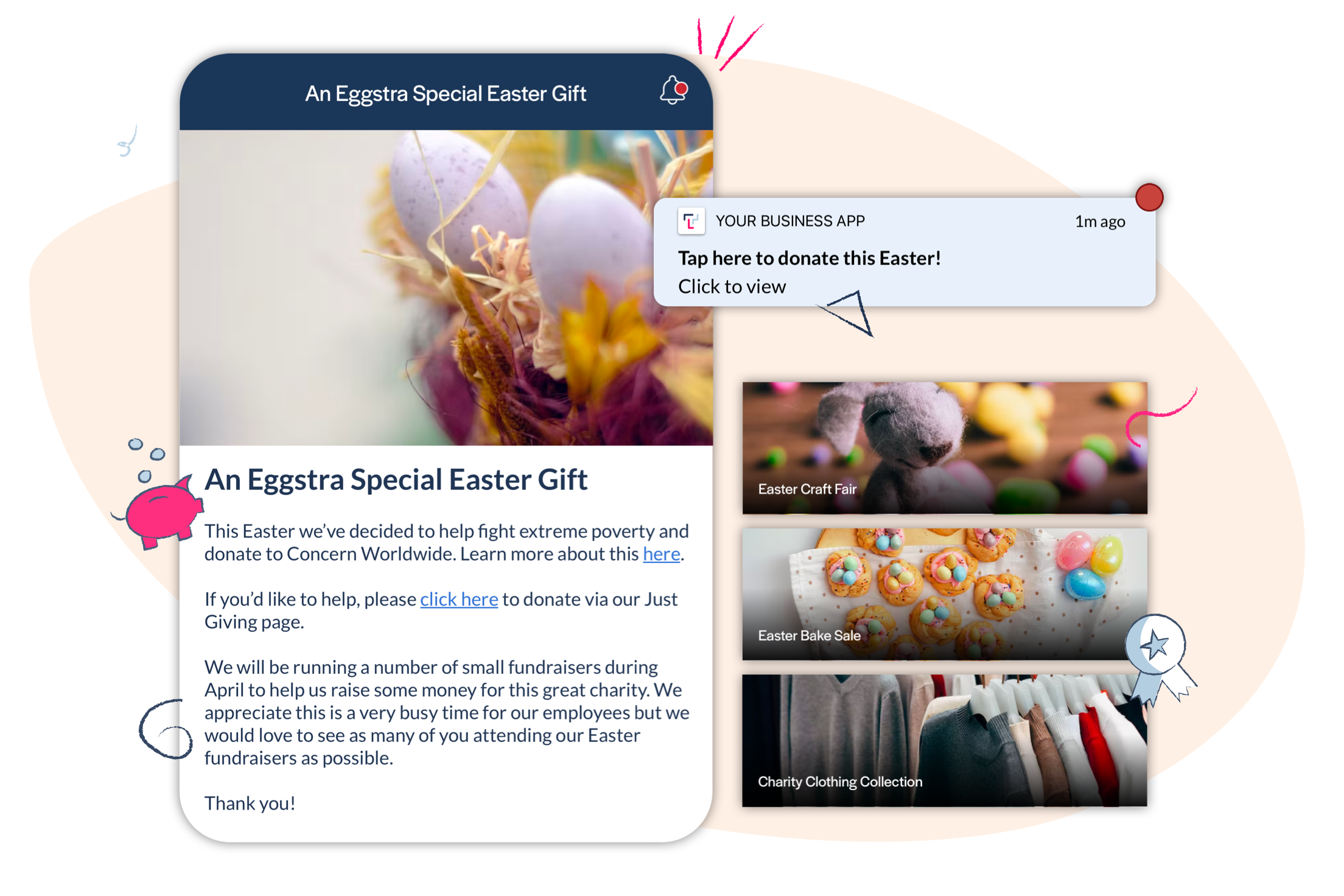 Sample push notification text: Tap here to donate this Easter!
