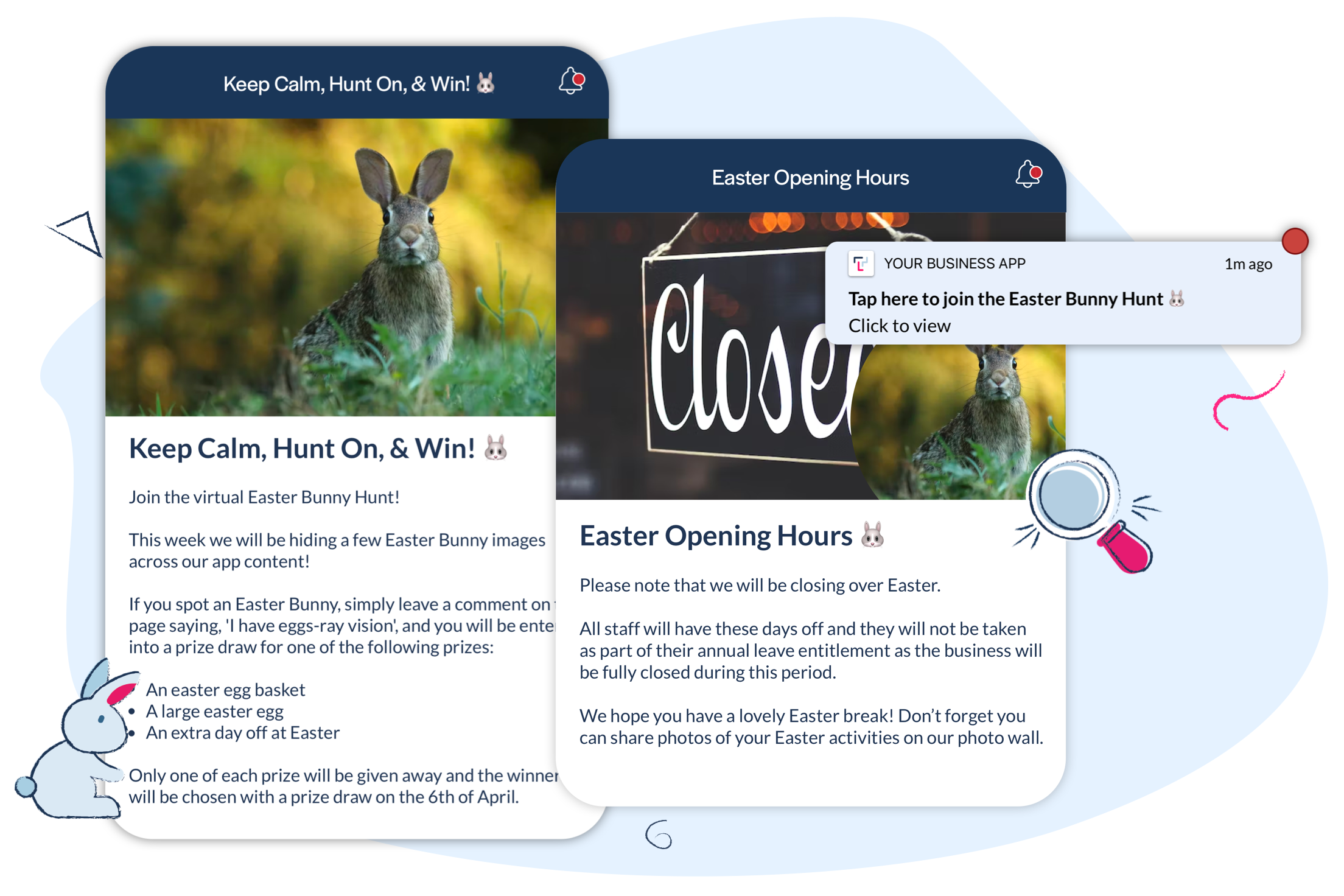 Sample push notification text: Tap here to join the Easter Bunny Hunt 🐰