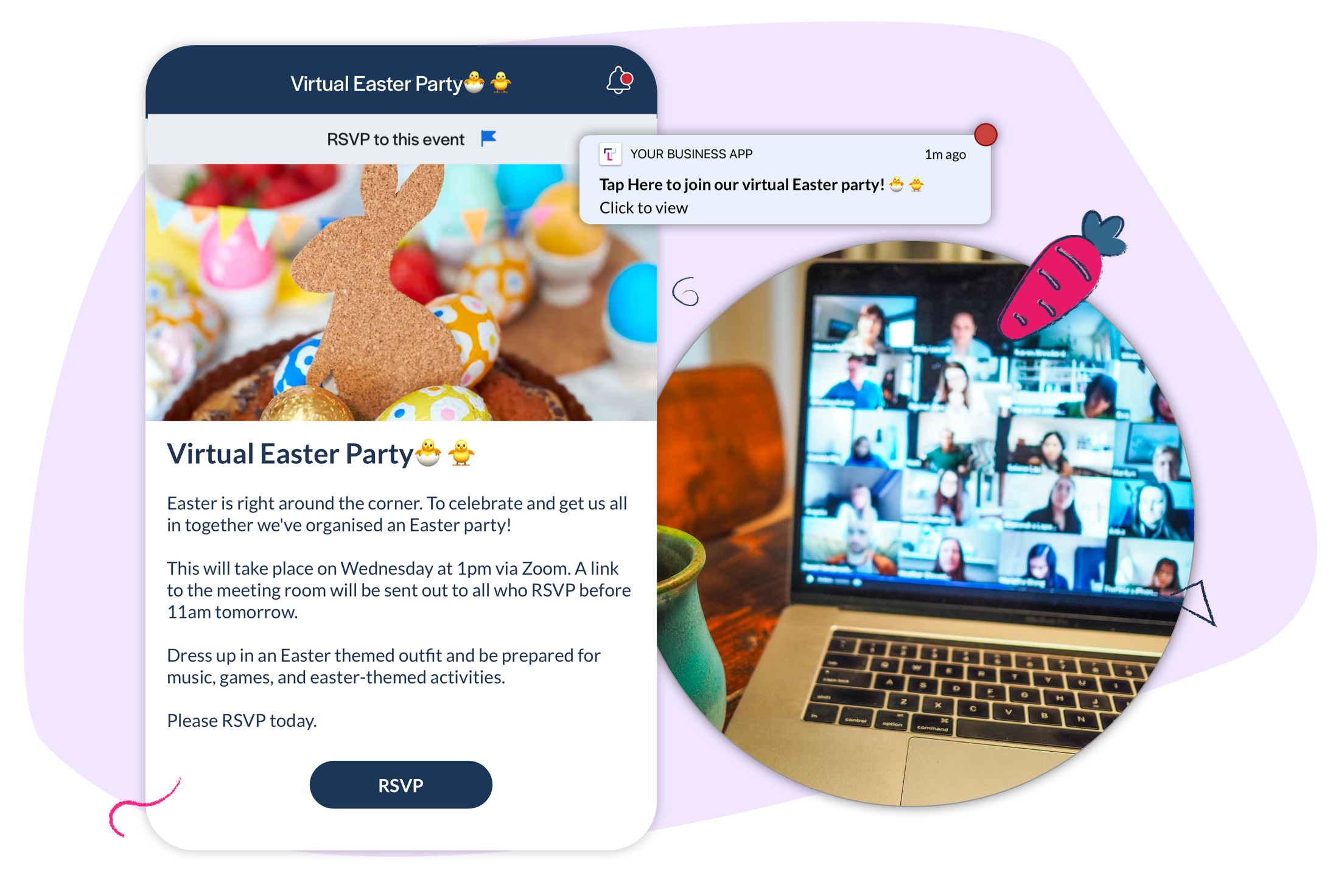 Sample push notification text: Tap Here to join our virtual Easter party! 🐣