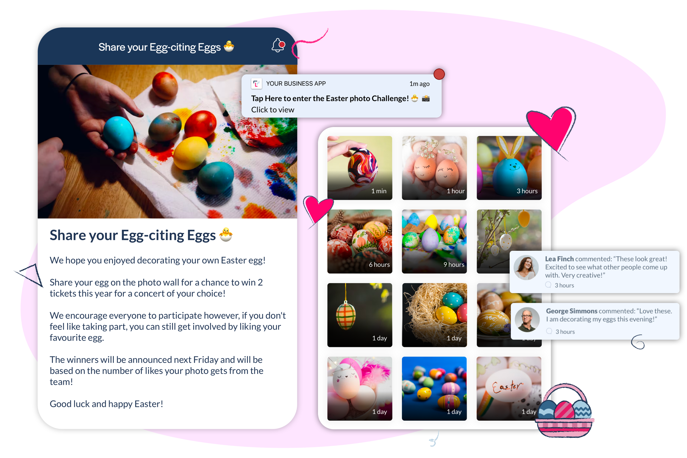 Sample push notification text: Tap Here to enter the Easter photo Challenge! 🐣 📸”