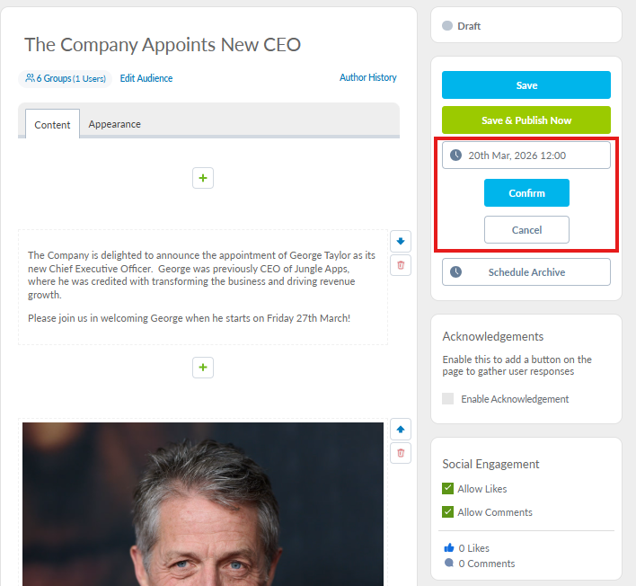 You can unschedule if you need to make changes and you can also schedule a time to archive the post once the content is no longer required. Simply click on Schedule Archive and select your date and time