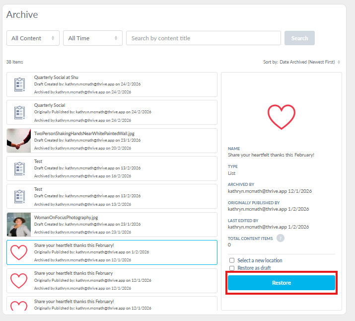 Then click on the piece of content you want to restore and select whether you want to restore the content to a new location and/or as a draft, and click Restore